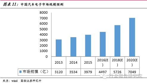 汽車電子類產(chǎn)品通常落后消費類電子產(chǎn)品一個時期,正如過去幾年手機行業(yè)所經(jīng)歷的那樣,汽車業(yè)正在由“功能機”向“智能機”發(fā)展,這將給電子行業(yè)帶來新的增長引擎。受惠于各國汽車安全政策加持,近期汽車電子輔助行車安全的趨勢已十分明確,越來越多類似TPMS、倒車影像、自動剎車系統(tǒng)等新應(yīng)用崛起。各大車企、互聯(lián)網(wǎng)公司紛紛加快在車聯(lián)網(wǎng)和自動駕駛領(lǐng)域的產(chǎn)業(yè)布局,車聯(lián)網(wǎng)有望成為第一個實現(xiàn)的物聯(lián)網(wǎng)應(yīng)用空間廣闊,存量與增量汽車市場規(guī)模可觀。2015 年中國汽車電子市場規(guī)模為3,979億元,同比增長12.6%,2013~2015年中國汽車電子市場規(guī)模平均增長率為13.7% 。中商產(chǎn)業(yè)研究院預(yù)測2016年中國汽車電子市場規(guī)模為4497億元。賽迪顧問預(yù)計到2016年中國汽車電子市場將保持 10%以上的增速,同時汽車電子在整車成本中的占比將超過50% 。我們判斷中國汽車電子市場增長方式正在由汽車產(chǎn)量增長轉(zhuǎn)向功能需求驅(qū)動。